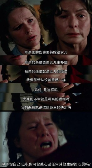 而种关系模式处理也来源于玛利亚与母亲的互相伤害,母亲也时常让玛利亚感到痛苦难过就好像母亲是故意的,她好像总是达不到母亲的要求,好像母亲总是不喜欢她。母亲灌输给玛利亚要强大和独立的处事态度,这种高强度的独立和强大(尤其是独立)也暗含对外隔绝不依赖他人为生,否认了自身可能会有的脆弱,这也间接导致了玛利亚不知如何应对自己脆弱、难过时候的心情,因为她被教育强大和靠自己,并且她夸赞女儿的时候运用了这一词汇,表现女儿的独立自主,而女儿却止不住黯淡哭泣,因为这种想法让人难以忍受。