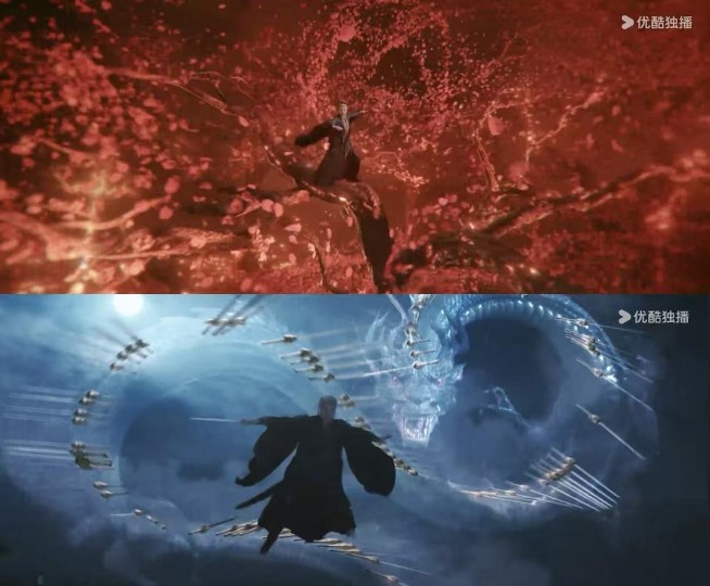 杀人要杀人,就要先学会“人吃人”,这也是为什么苏暮雨一直向往着平凡的生活,因为曾经经历过平凡的幸福,而成为无名者的日子里,又切身体会到暗河的残酷和血腥,所以苏暮雨走的每一步,都是在坚守自己的底线 而苏昌河不想离开,更想入局,他想彻底改变暗河,也是不希望有一天要再次二选一,他要自己和朋友都能活在阳光之下! 至此,俩人对于大家长事件的分歧就可以理解了,苏暮雨不愿被阴谋漩涡裹挟,所以坚守自己的职责,不愿反叛;而苏昌河认为暗河要改变,大家长是必须处理的拦路石,唯有旧秩序的象征倒下,新秩序才有可能建立 昔日好友拔剑相对,人物身上挥之不去的,是暗黑悲惨的底色 最后是画风制作上的暗黑 不得不夸一下剧集的制作水平,因为我就是被预告里的场面呈现所吸引来的 大场面的制作看得人眼前一亮又一亮,万树飞花、落雨成剑、血魔阎罗......这个水平能看出来钱都花在刀刃上了