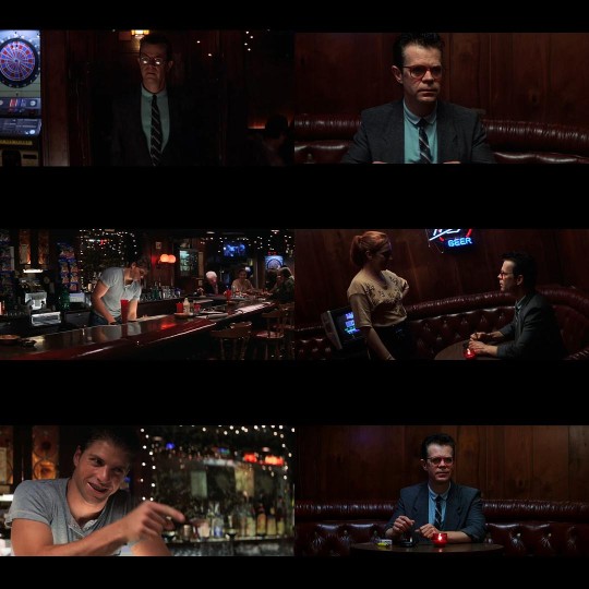 不过《木》中有一个镜头我们可以跳出PTA,来到威廉姆·H·梅西所饰演的同性人士Donnie身上。在53分左右,摄影机跟随Donnie进入酒吧落座,又随着他的视线飘向他心仪的帅哥酒保,再跟随另一位服务员的的运动转回Donnie身上,这是非常常见的“PTA式镜头运动”。但紧接着,随着服务员的离开,镜头又一次不自觉地转向酒保,并以超过正常视角的特写作为结束。紧接一个Donnie如痴如醉的推镜头。此时我们意识到上一个镜头的第二次转头不仅仅来自于一种视角,而是来自一次臆想。类似这样的调度在《私恋失调》后PTA都能更加熟练且冷静的使用。《大师》中华金的狂奔所带来的焦虑是角色所散发的,而非导演的不安;《魅影缝匠》中对DDL在跨年派对寻找Alma的跟随也没有了那种对机械运动的迷恋,而是角色身上不安全感的客观呈现;一直到《甘草披萨》中更加轻盈自在的呈现,两个孩子奔跑在圣费多南谷的街道上。